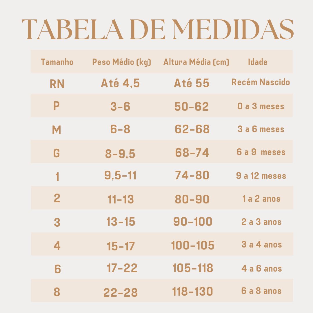 A referência por idade é uma média, cada bebê e criança tem seu biotipo, podendo variar o tamanho da roupa! Importante se atentar as medidas, uma sugestão é medir alguma roupa que ele ja tenha para se basear, pois na tabela são as medidas da roupa!